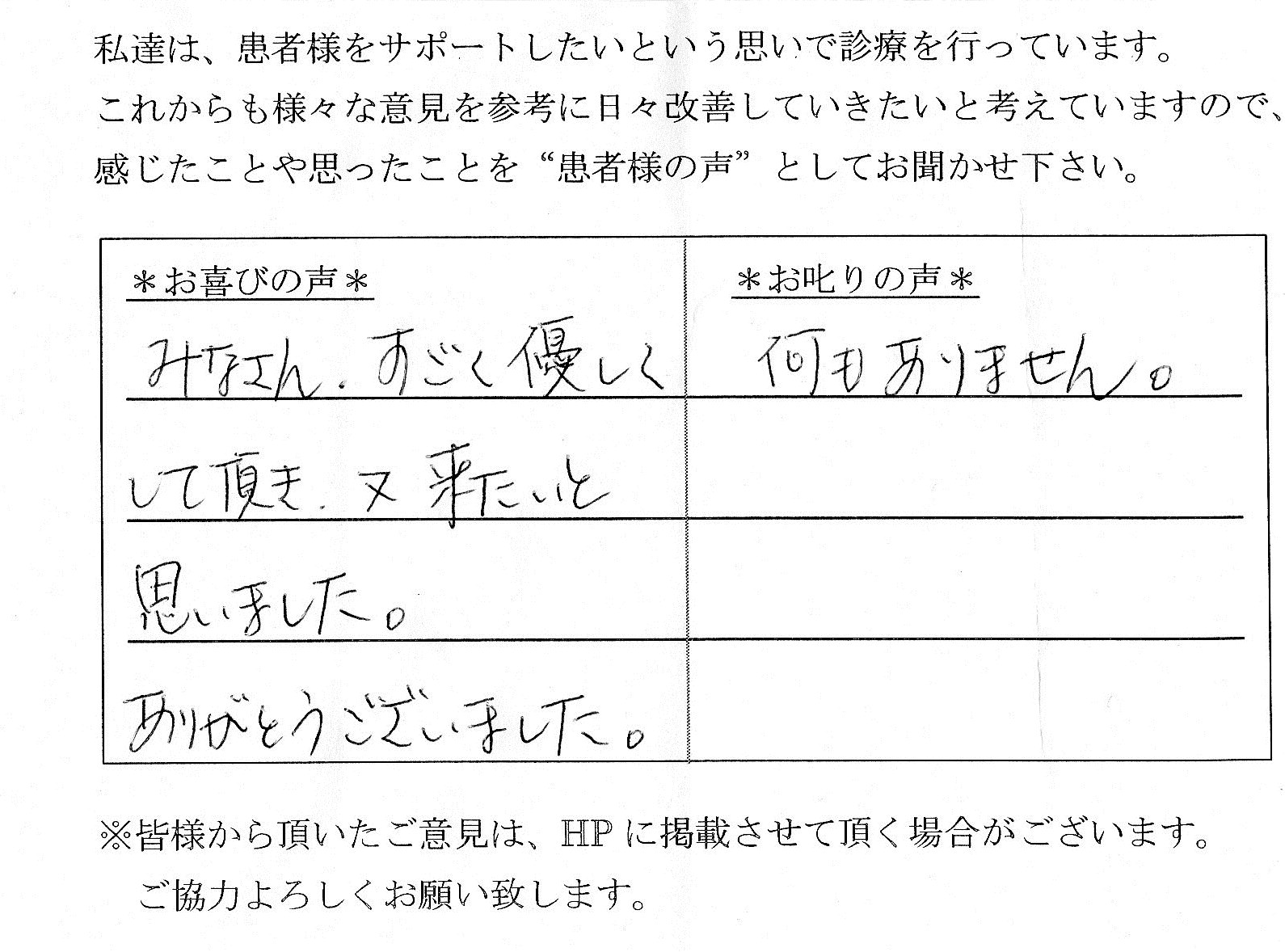 治療を受けることが出来ました。皆さんとても優しい方々でした。